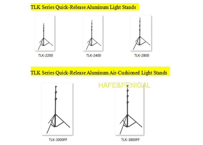 The TLK Series comprises professional-grade quick-release aluminum light stands designed for photographers, videographers, and studio technicians. These stands feature a rapid-deployment mechanism that allows the legs to automatically extend when placed on the ground and retract when lifted, significantly reducing setup and breakdown time. The series includes both standard quick-release models and air-cushioned (FP) variants for smoother height adjustment and added durability.